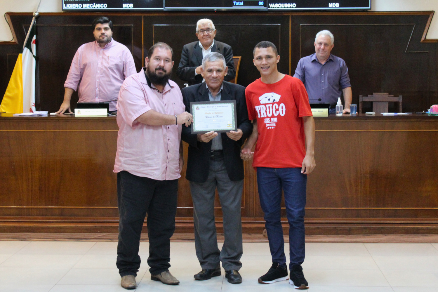 Baixar fotoVereador Casadinho entrega Moção de Aplausos, em forma de Título, ao ex-Vereador Cássio de Freitas, representado por Márcio Tavares e Joel Gonçalves