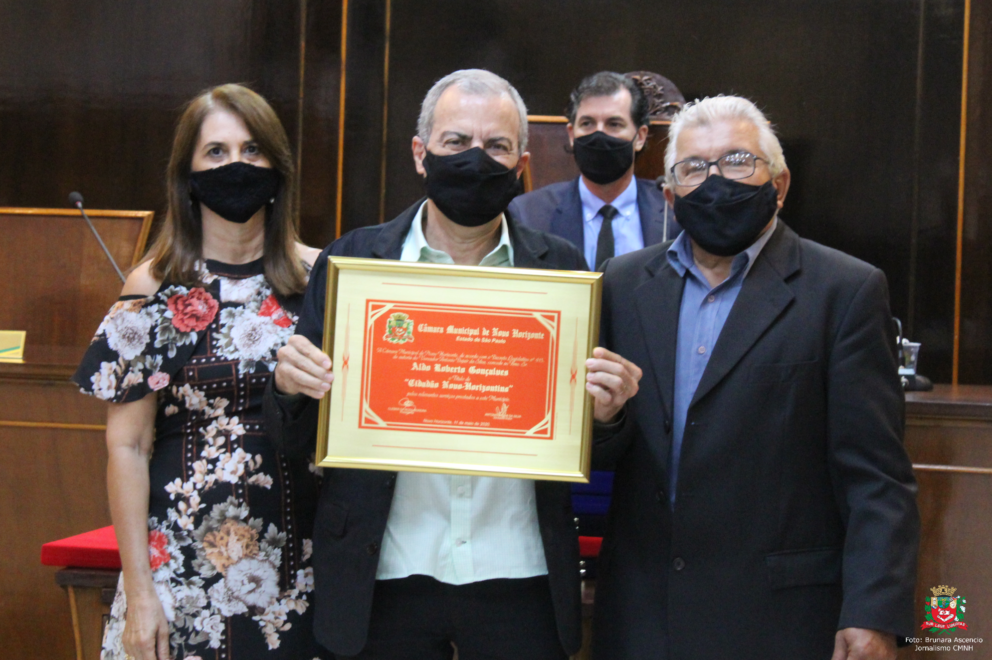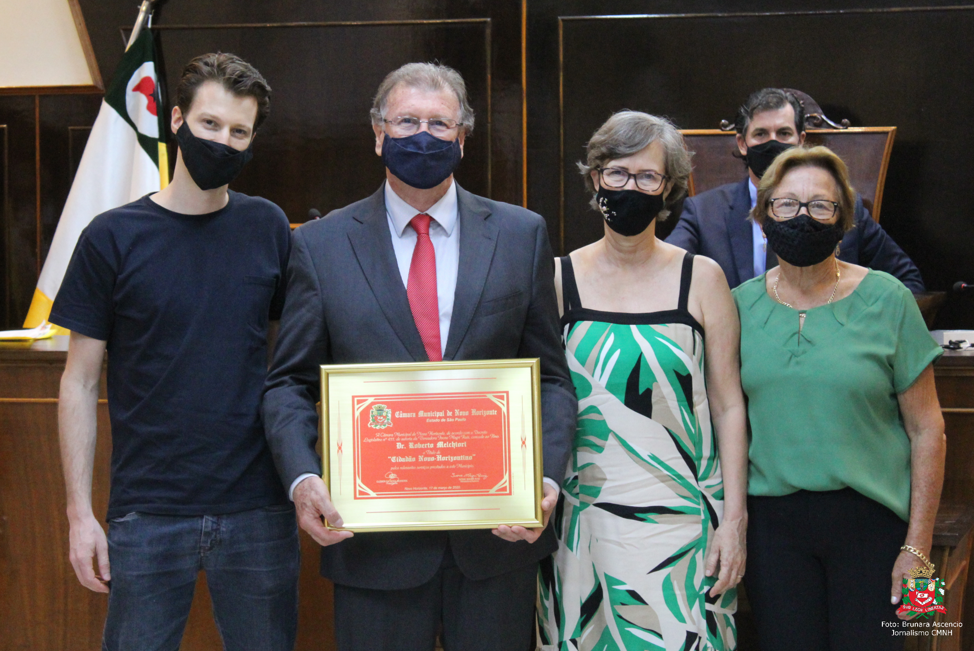 O Título de Cidadão Novo-Horizontino foi entregue à Aldo Roberto Gonçalves, concedida pelo vereador Jair Gordo; e ao vereador Dr. Roberto Melchiori, concedida pela vereadora Ivone Ruiz. A honrara pode ser outorgada para quem não nasceu no Município, mas aqui residindo, tenha colaborado com iniciativas em benefício de Novo Horizonte e da coletividade.