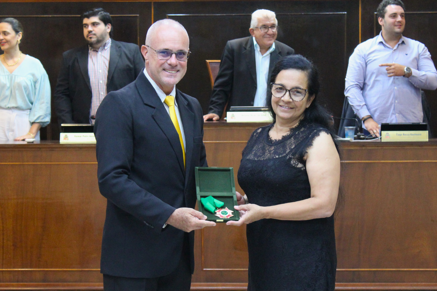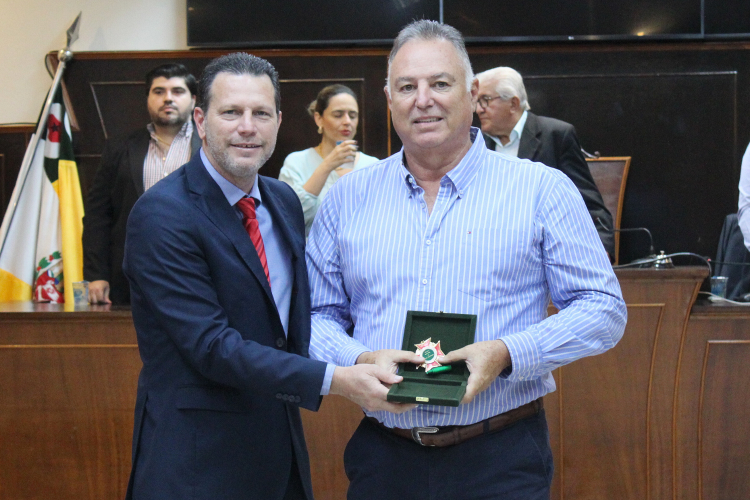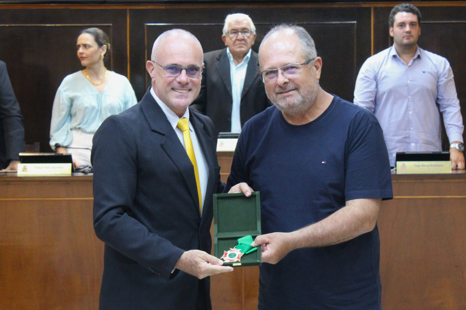 O Vereador Vasquinho fez a entrega de Medalhas "28 de Outubro" a Carlos Alberto Pereira de Carvalho e à Cooperativa de Eletrificação e Desenvolvimento Rural da Região de Novo Horizonte – CERNHE. O Vereador Rodrigo do Prado fez a entrega de Medalha "28 de Outubro" a Fernando Nemi Costa.